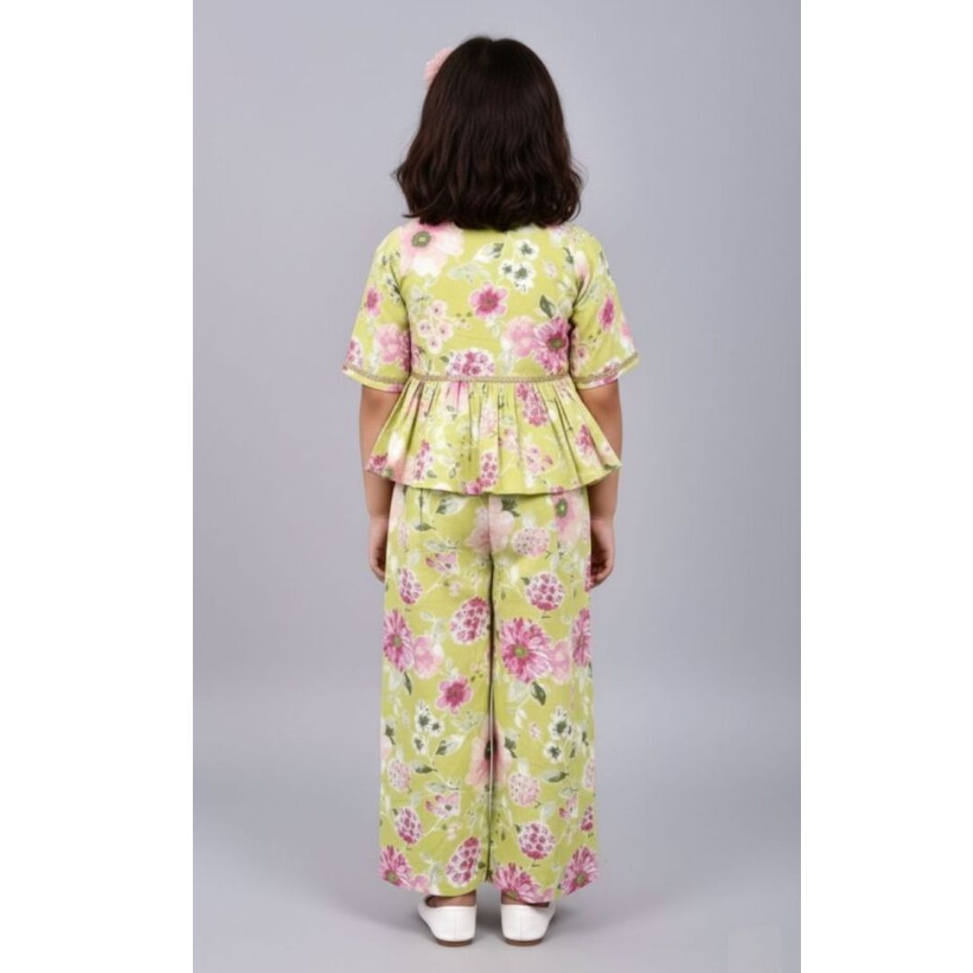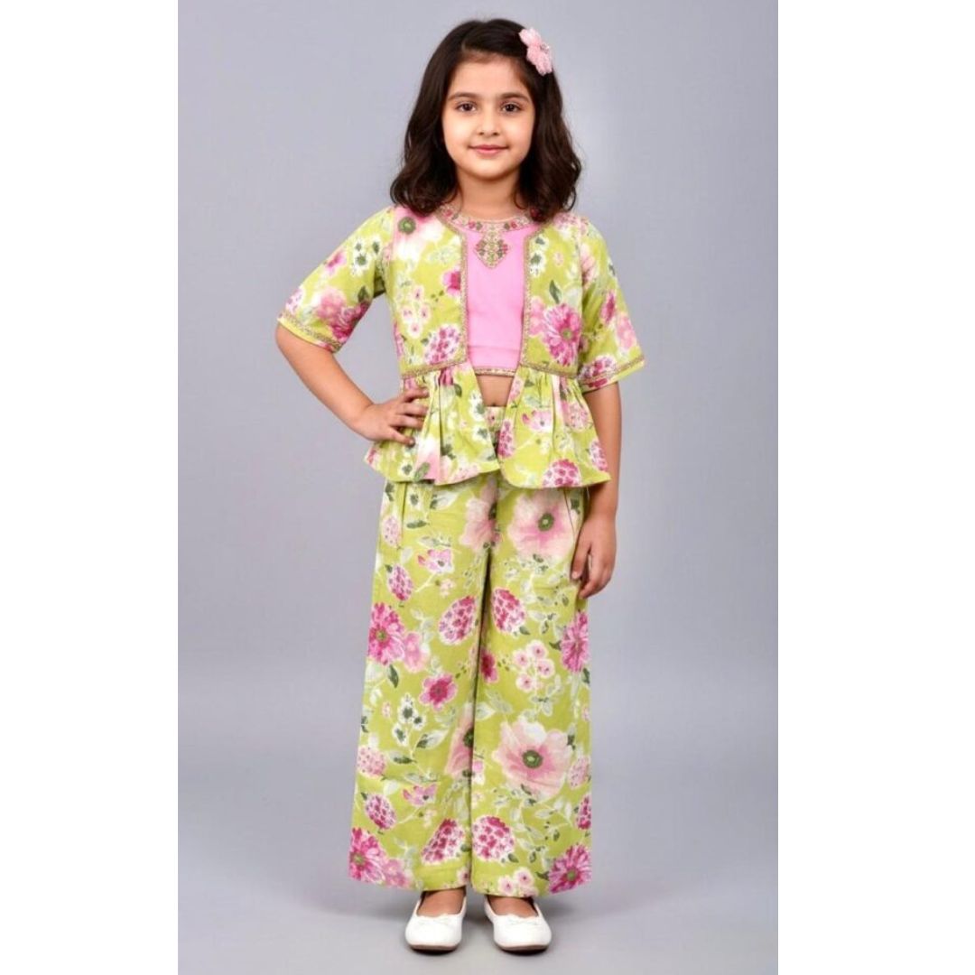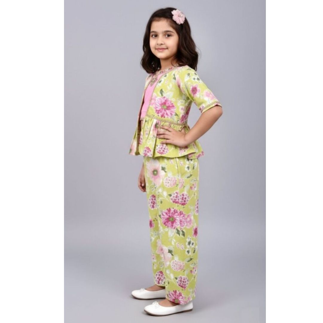 | * Complete 3-Piece Set: Stylish Peplum Jacket, Inner Top, and Wide-Leg Palazzos. * Modern Ethnic Look: Trendy Indo-Western fusion with a vibrant floral botanical print. * Kid-Friendly Fabric: Soft, breathable, and lightweight for all-day festive comfort. * Comfortable Fit: Wide-leg trousers with an elasticated waist for easy movement. * Versatile Occasion Wear: Perfect for Weddings, Festivals (Diwali/Eid), and Parties. |