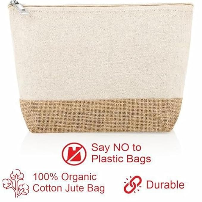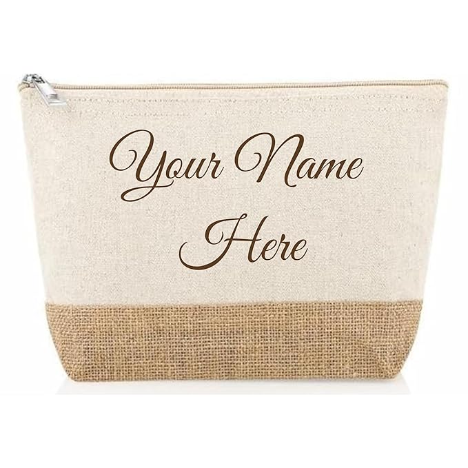 Add a personal touch to your everyday essentials with this customisable cotton and jute makeup pouch. Measuring 27 x 13 x 5 centimetres, this medium-sized pouch offers ample space for storing cosmetics, stationery, or other daily necessities. The pouch features a stylish two-tone design with natural jute at the bottom and soft cotton on top, where your chosen name can be elegantly displayed in beautiful script. The durable construction combines 100% organic cotton and jute materials, making it a practical alternative to plastic bags. The smooth metal zipper ensures secure closure, while the spacious interior keeps your items organised and easily accessible. Whether for yourself or as a thoughtful gift, this personalised pouch adds both functionality and style to your everyday carry. The natural materials create a rustic yet sophisticated appearance that complements any style.