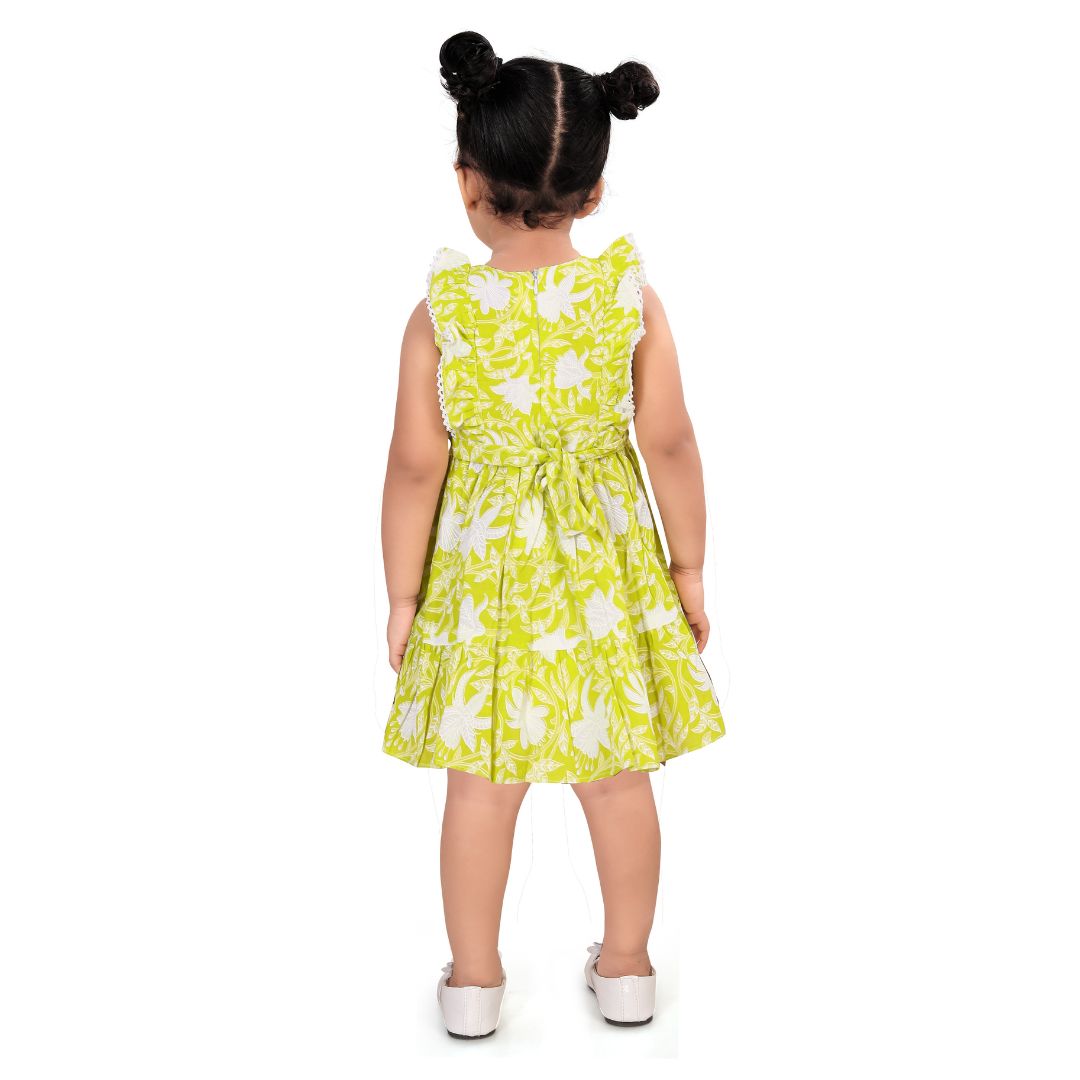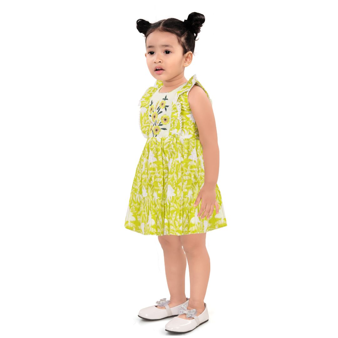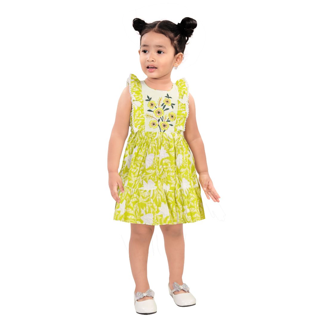 | • One-piece ruffle dress • Cute sunflower floral print • Soft sleeveless design for easy movement • Lightweight, breathable & skin-friendly fabric • Comfortable fit, perfect for active toddlers • Ideal for casual wear, outings, playtime & summer days • Easy to wash and maintain |