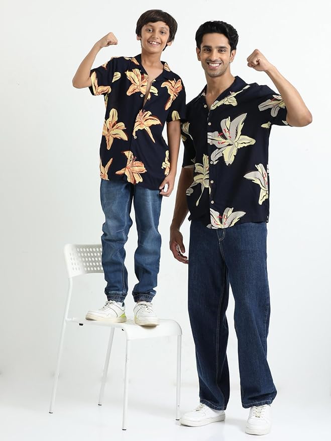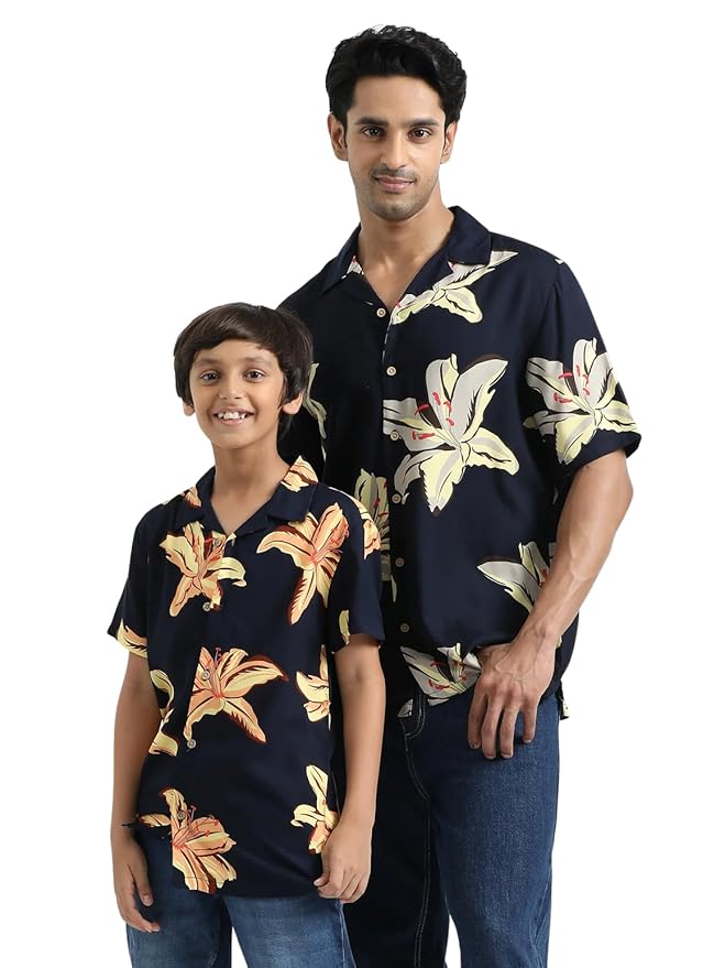 • This Dad & Son Floral Printed Twinning Shirt Closure :- Button | Colour :- Navy Blue | Sleeve Type :- Half Sleeve | Collar :- Cuban Collar | Fabric: 10 0% Viscose | Hemline :- Curved Hemline