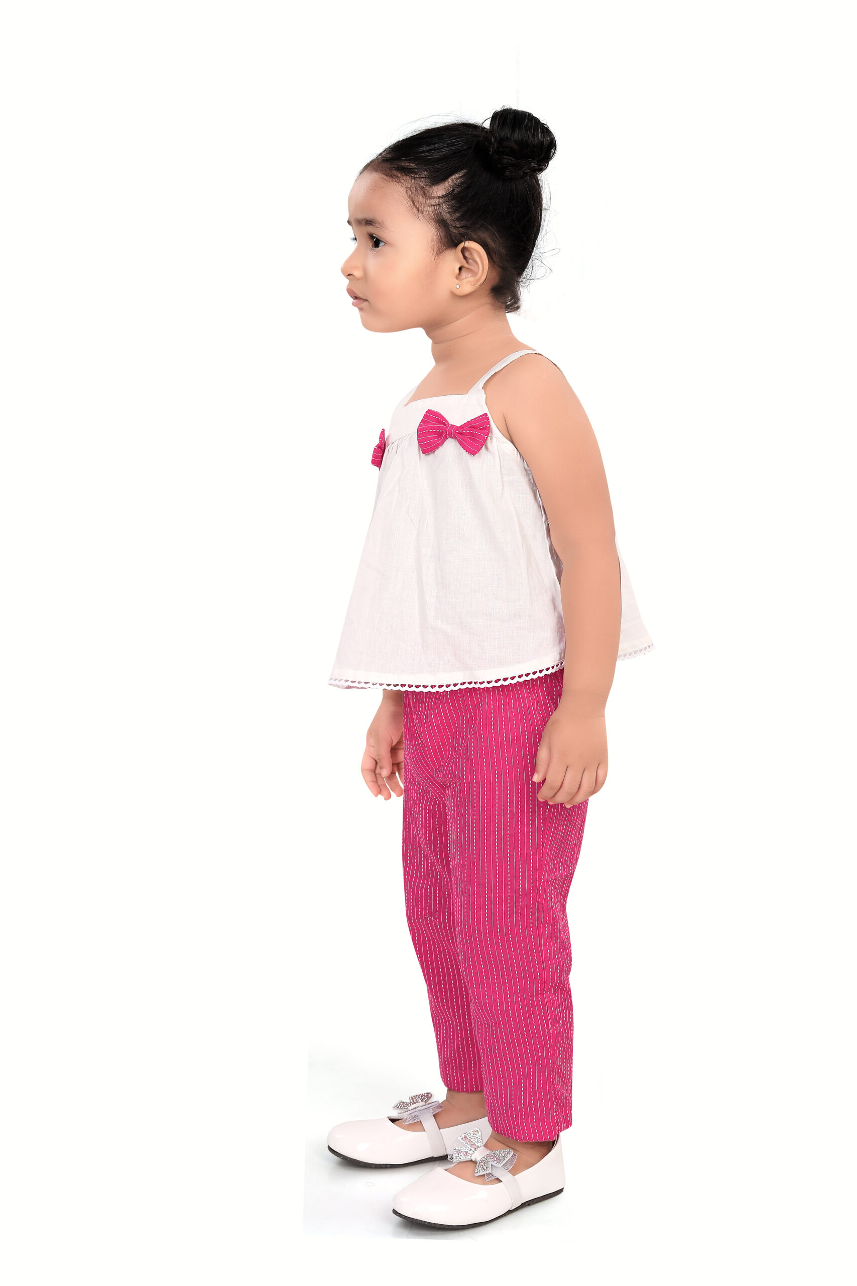 White top with pink bows and pink pants